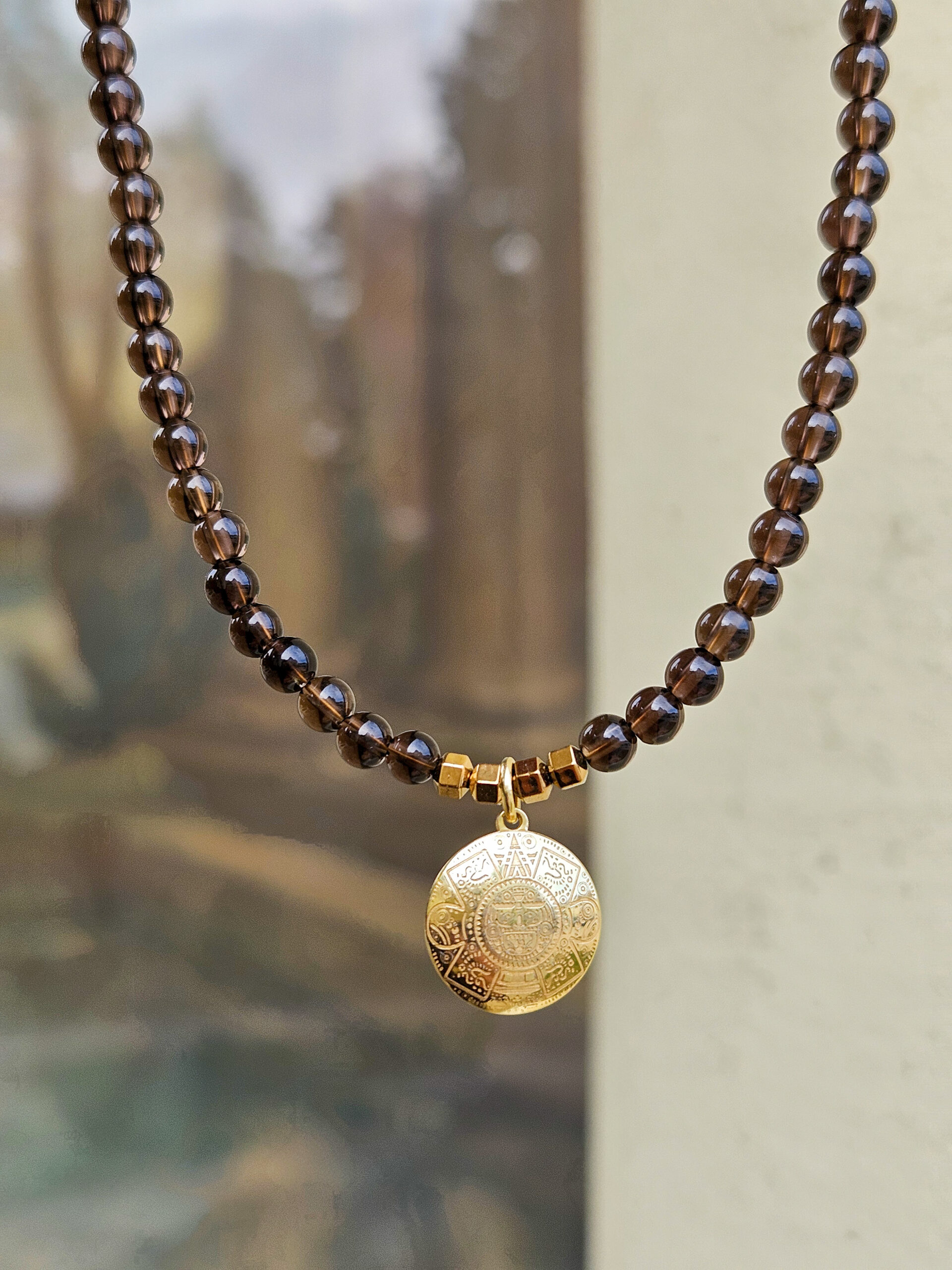 Naszyjnik wykonany jest ręcznie z naturalnych kamieni kwarcu dymnego w kształcie polerowanych kulek oraz zawieszki azteckiej.